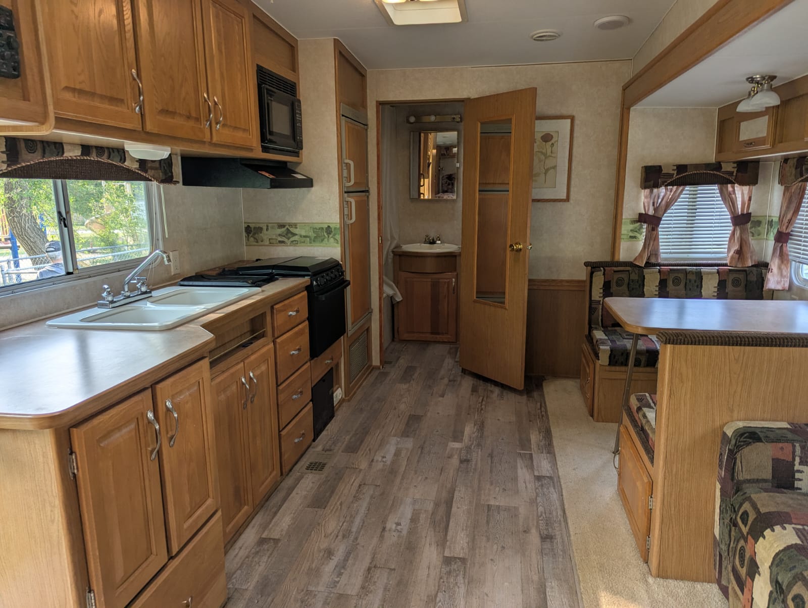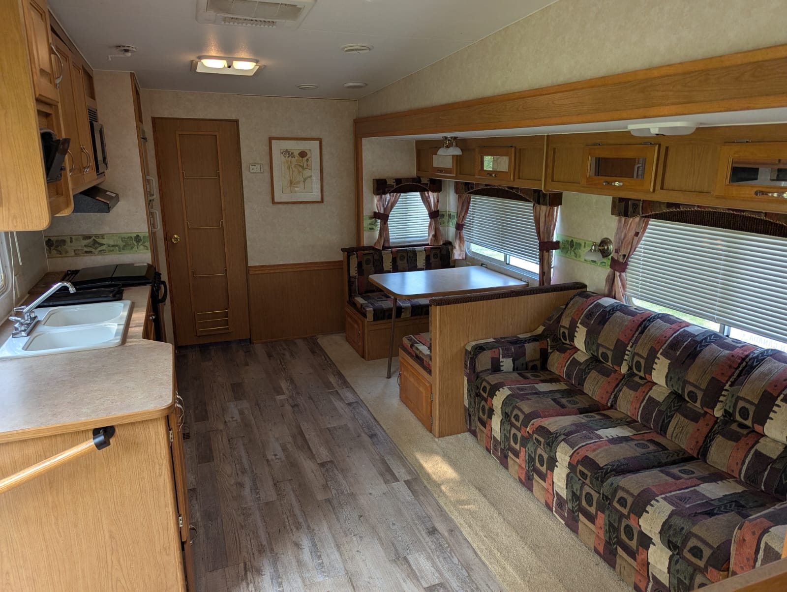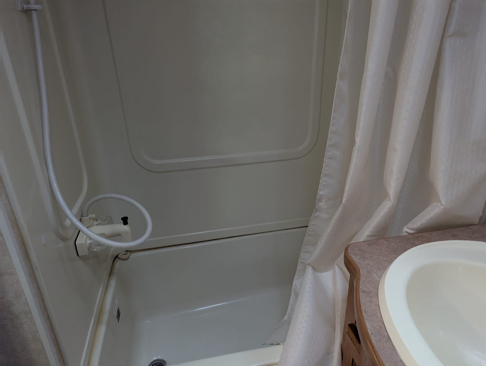 One of the best features? A full rear bathroom with a spacious shower and plenty of storage. You’ll have all the space you need for toiletries and linens, or anything else you might need for the road. With new flooring just installed, you’ll enjoy a refreshed interior and one less renovation on your to-do list.