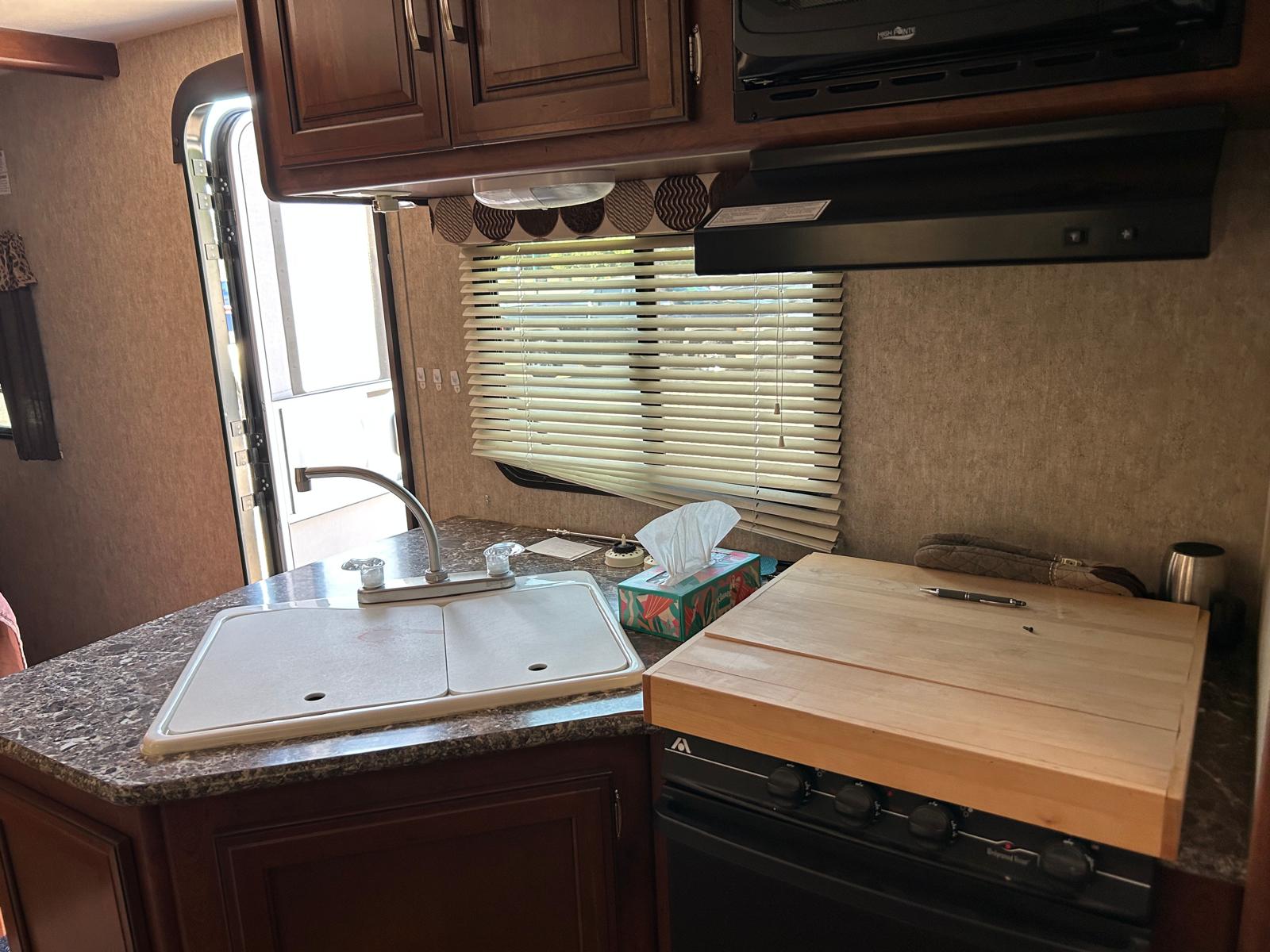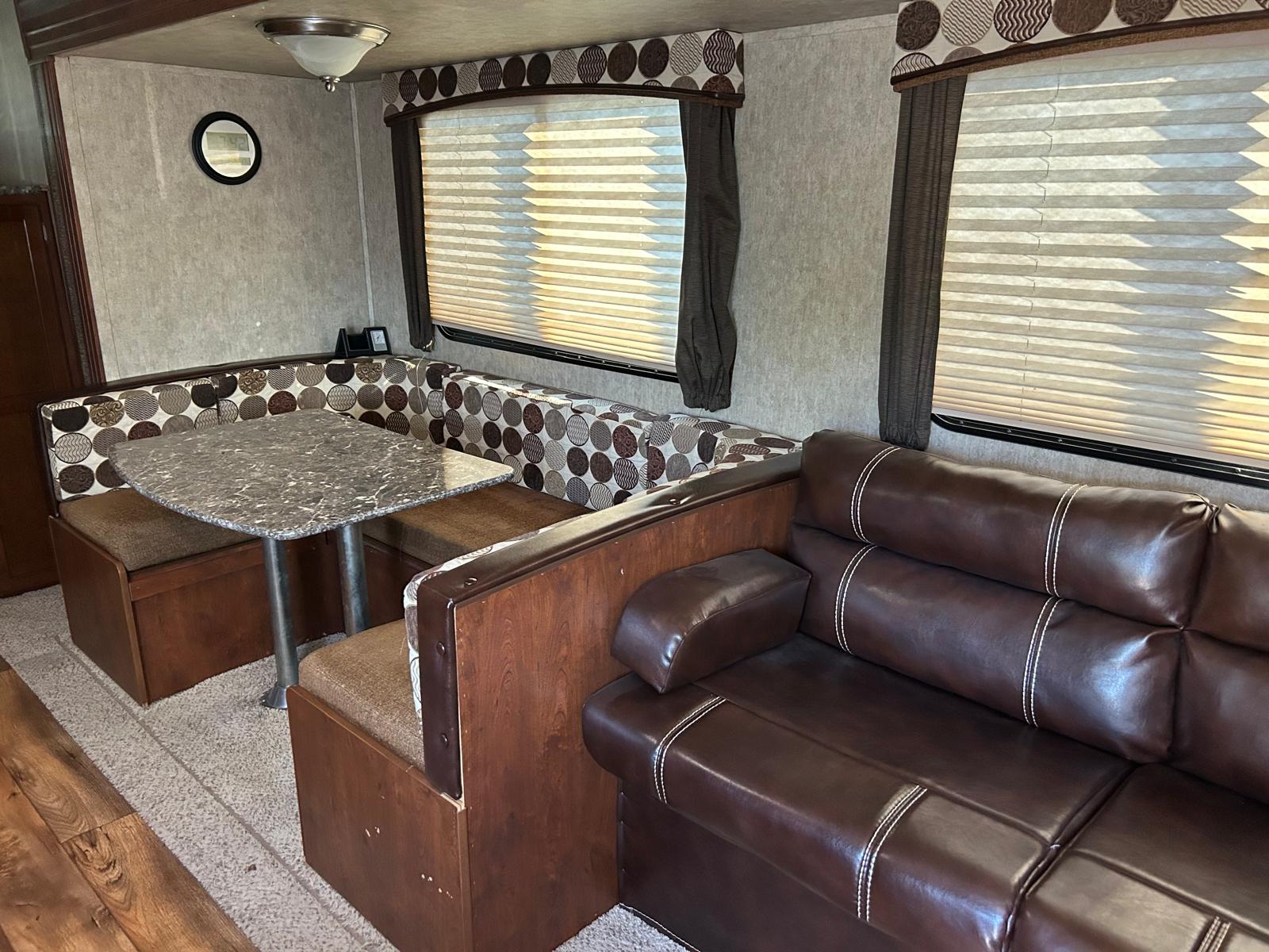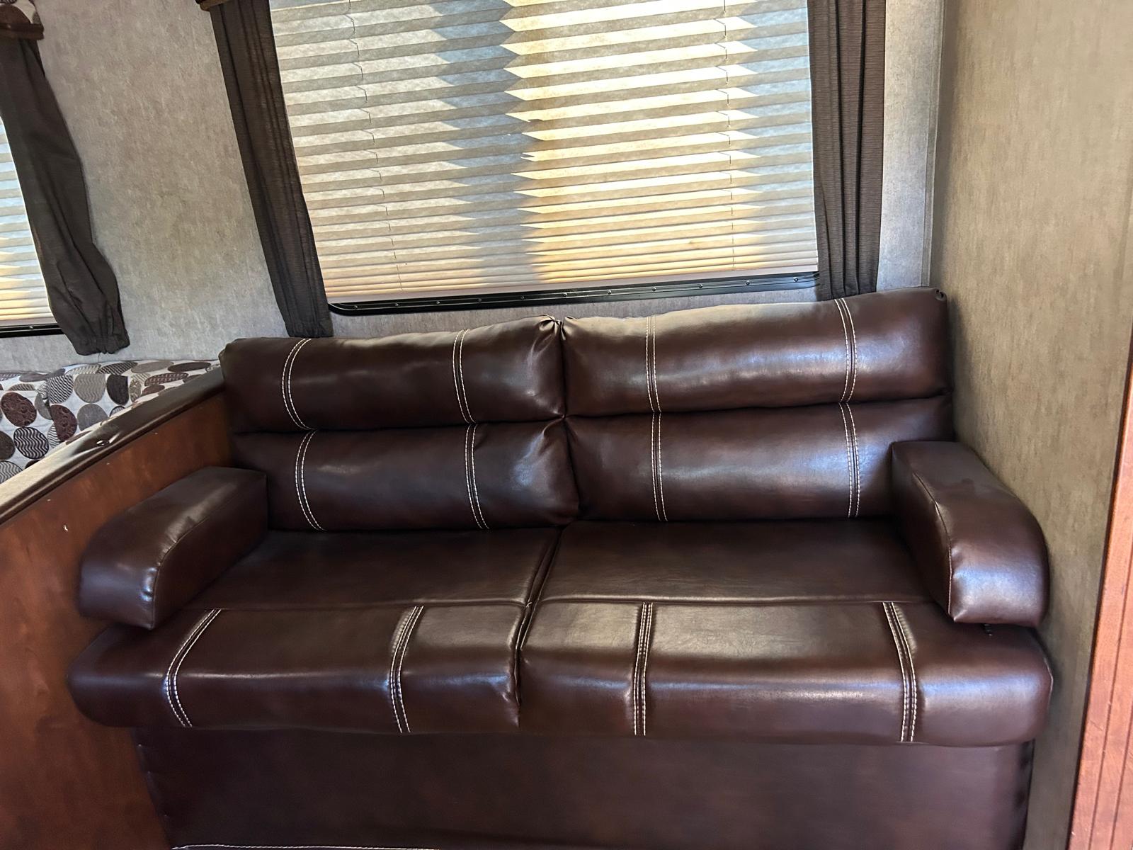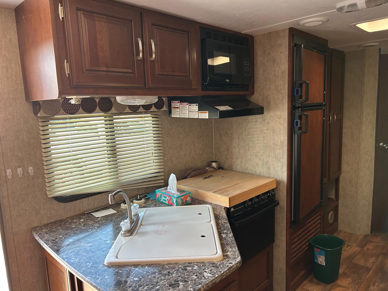 The central living area adds even more convenience. A large slide creates an open feel, while the U-shaped dinette comfortably seats a group and quickly converts into extra sleeping space. Altogether, this trailer comfortably sleeps up to six people. The fully equipped kitchen features a fridge, stove, oven, microwave, and double sink. No matter where you are, you’ll have everything you need to cook and dine with ease.