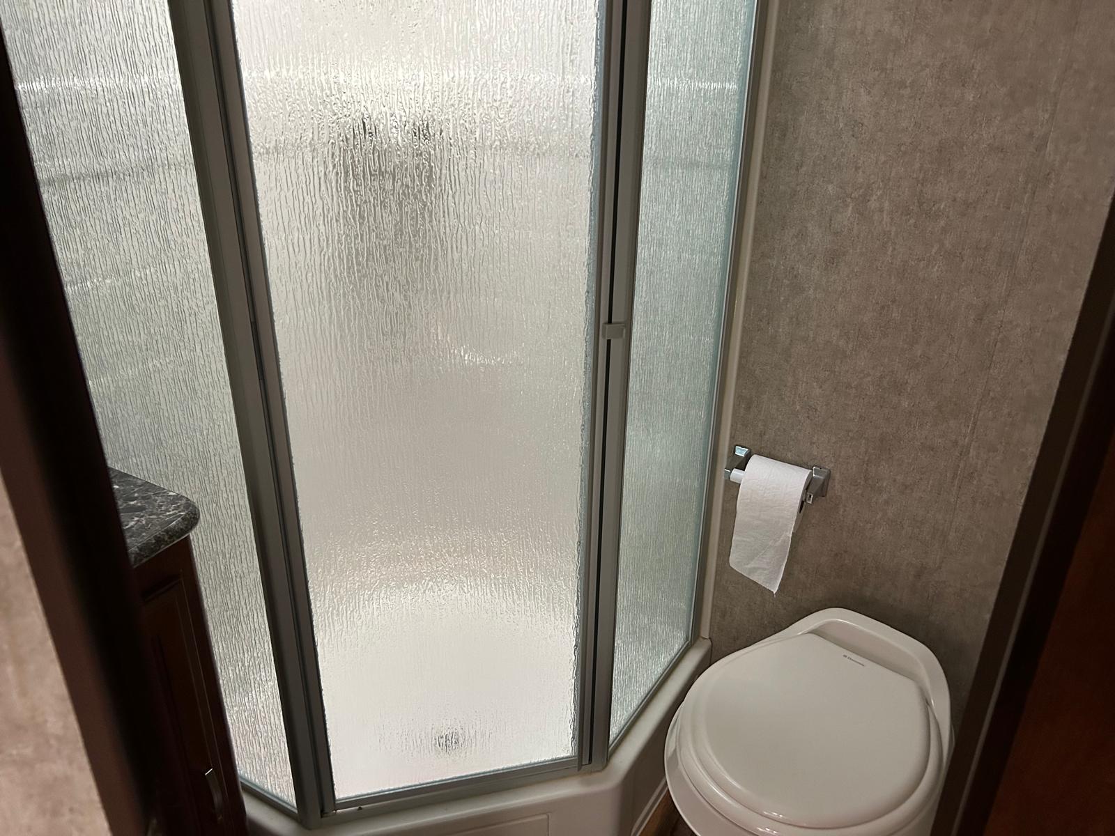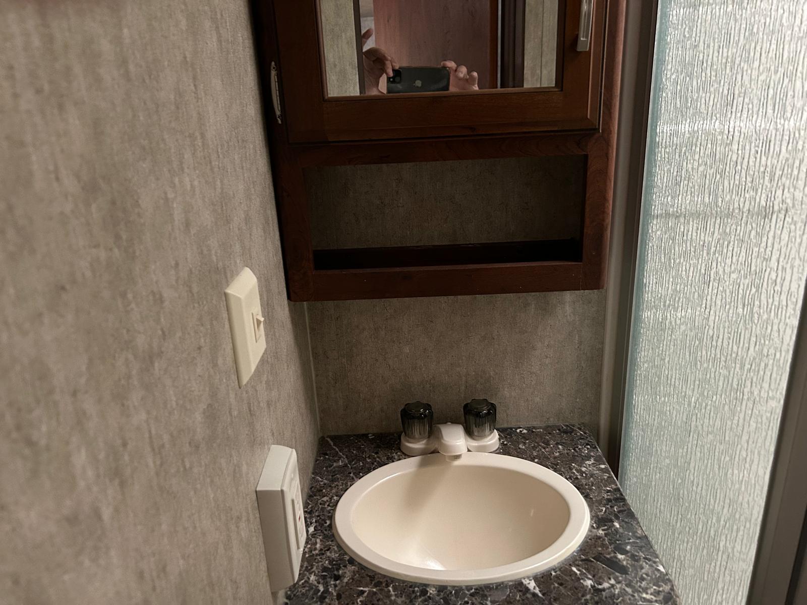 The rear bathroom is a standout feature, offering a large space with ample storage, a corner shower, and a full vanity. Its perfect for longer trips or those who value a bit of extra room. At the front, a cozy queen bedroom includes overhead cabinets and side wardrobes, offering plenty of room to stay organized on the go.
