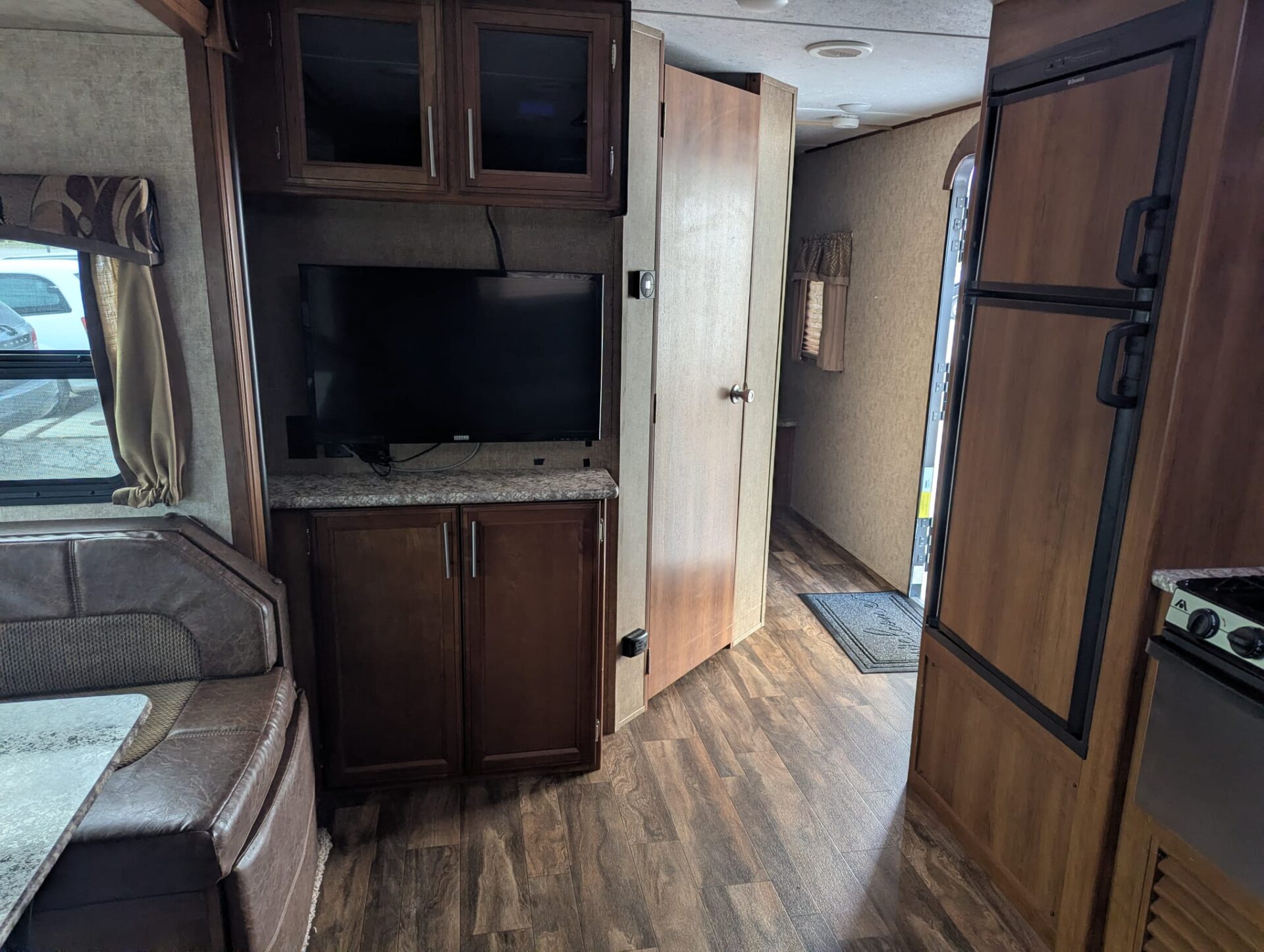 Inside, you’ll find comfortable sleeping arrangements for up to six people, and comfortable furnishings. Additionally, the fully equipped kitchen and bath, will have all your needs met. This trailer brings a premium travel experience at a manageable size a budget.