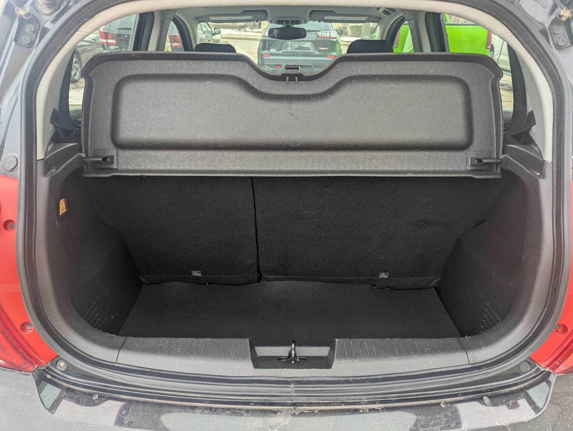 Although the vehicle is small, there is practical cargo versatility with a rear seat that folds flat. Safety is also a priority with features including a rear camera, stability control, traction control, and multiple airbags.